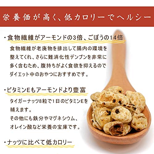 タイガーナッツの食物繊維は非常に多く、ごぼうの14倍、アーモンドの3倍あります。食物繊維は腸内環境を整え、便秘解消やむくみにも効果があります。
